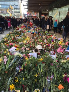 Än vandrar man för att lägga blommor till minnet av alla som dog eller skadades förra fredagen. Man blir berörd men kanske allra mest av alla som skrivit spontant på väggar och gatustenar. Eller ritat hjärtan i guld som vid den första platsen i närheten av Adolf Fredrik Kyrkogata. På Åhléns vägg sitter hundratals post it lappar med budskap. Här är blomhögen högre och meddelande fler. Kanske för att det har var 11-åringens plats. Som mamma är det första man tänker ”om hon bara hunnit gå 20 meter till”. SÅ lönlöst men det går inte att ungå att tänka på hur ödet slår till ibland.