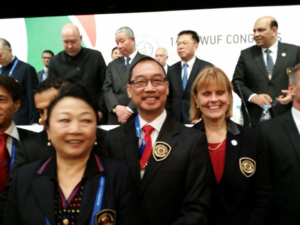 Idag hade jag en presentation på det internationella wushuförbundet IWUF:s årsmöte. Det handlade om ett graderingsarbete som jag tillsammans med andra tog fram under möten i Beijing för ett tag sedan. Presentationen gick bra vad jag förstod av andra som lyssnade men man vet aldrig. I den här världen är det inte så vanligt att man säger rakt ut vad man tycker om det är negativt. Framtiden för utvisa men kul var det i alla fall vilket kanske syns på bilden.