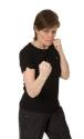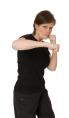Raka slag, hook och upper cut. Fler än så behövs inte för att arbeta igenom överkroppen på ett enkelt och rejält sätt. Knyt händerna med tummen på utsidan men inte så att den sticker ut. Stå med det ena benet längre fram än det andra i en så kallad free stance.