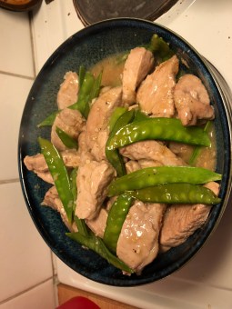 Jag fräste kubstrimlor av fläskfile i mängder med krossad ingerfära som blev den huvudsakliga kryddan tillsammans med en pepparmix. Redningen som vanligt med majsenamjöl och vatten.