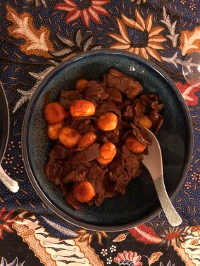 Biff med kastanjer gick busfort eftersom jag fuskade med färdiga kastanjer. Den strimlade biffen la jag i en minikort kvartsmarinad på soyasås, äggvita, majsenamjöl och torkad rödpeppar. Sedan var det bara att steka biff, slänga på kastanjerna och reda med vatten och majsenamjöl.