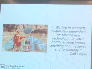 Idag fick jag nöjet att få lyssna på en föreläsning med professor Gail Cardew om vetenskaplig kommunikation. Hon är verksam på the Royal Institution i London ett institut som grundades av den dåvarande presidenten för Royal Society Joseph Banks. RI har i uppdrag att förbättra vetenskaplig kommunikation till allmänheten vilket man konstaterat fungerat ”sådär” under 200 års tid. RI var bland annat det institut där Carl Sagan med flera kända forskare höll sin Julföreläsningar vilket förblivit en tradition i över 200 år.