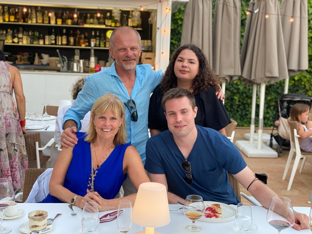 På min födelsedag igår var det träningsfritt på morgonen och vi gick ner till frukost. Servitören ledde ut oss i trädgården och när han tänkte gå vidare in bakom en spaljé bromsade jag för jag tyckte bordet innanför två såg trevligare ut. Jag fick en lätt knuff i ryggen och där innanför satt Christian och Masha helt oväntat. Jag trodde att jag kommit förbi alla överraskningar men jag hade verkligen inte misstänkt någonting den här gången. Nathalie saknades så klart men UK har fortfarande krav på 14 dagars karantän för återvändande så det gick inte.