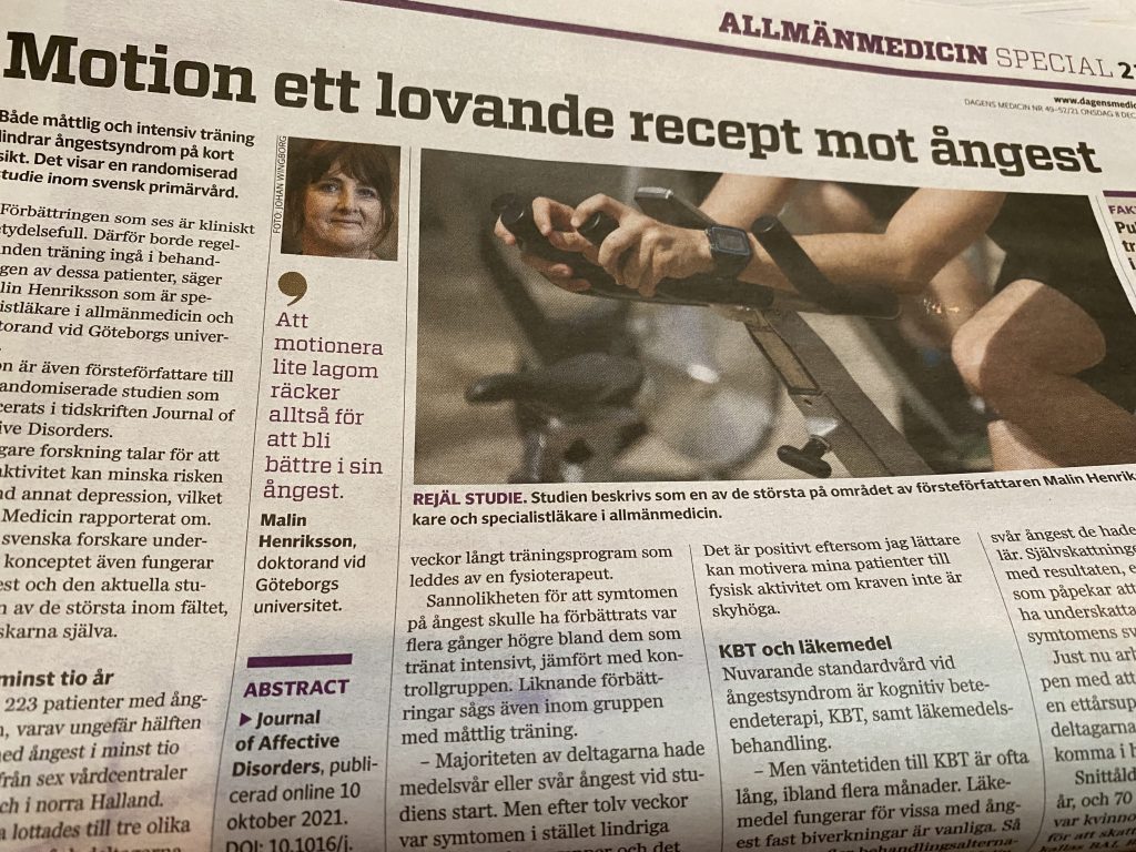 Rätt in i tigerns gap är det bästa sätt som jag kan beskriva den tidningsartikel som jag nu läser i Allmänmedicin Special. Rubriken lyder: Motion ett lovande recept mot ångest. Doktoranden från Göteborg menar att lite lagom motion räcker för att bli bättre i sin ångest. Den studie hon hänvisar till undersökte 233 patienter (70% kvinnor) med en snittålder på 39 år under 12 veckor. Resultatet visade att ångestsymtomen mildrats.
