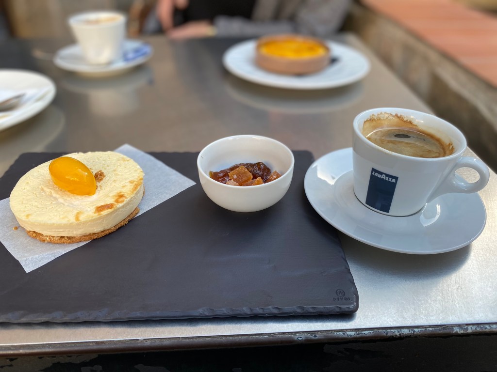 Place de Catalonia var livligt som alltid men nu med ansiktsmasker och avstånd mellan alla som gladdes i solskenet. En ny kombo väska dator/handväska, en kjol och en jumper blev dagens inköp innan vi tog en fika på en terass i gamla stan. Vilken fika det blev. Fantastisk Creme de Catalonia, Cheescake och kaffet var precis som man vill ha det.