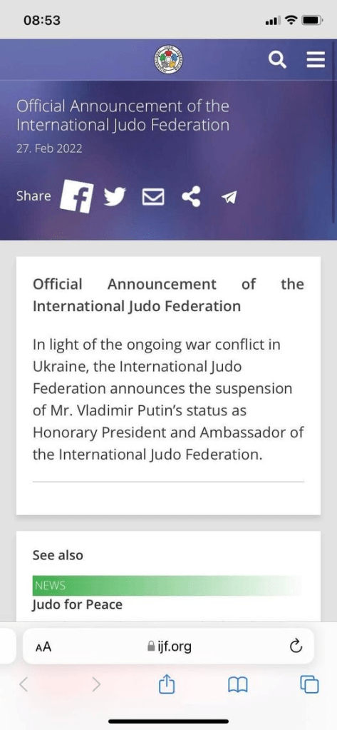 Putin har fråntagits sitt hedersordförandeskap i det internationella Judoförbundet med anledning av invasionen av Ukraina. Min man Anatoli och ett stort antal Judokas tog av sitt svarta bälte för att visa att man är emot kriget i Ukraina. Bra gjort!