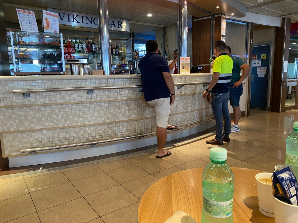 Där satt vi i tre timmar utan att någon visste vad som händer och sker. En brittisk kvinna höll på att svimma i värmen så henne fick vi lägga på golvet. Hundratals ungdomar delade terminalhallen med oss utan att ha minsta aning om köbildning. Till slut fick vi gå igenom säkerhetskontroll och slussas vidare ner till fordonsdäck som vi fick traska igenom parallellt med alla fordon som skulle på.