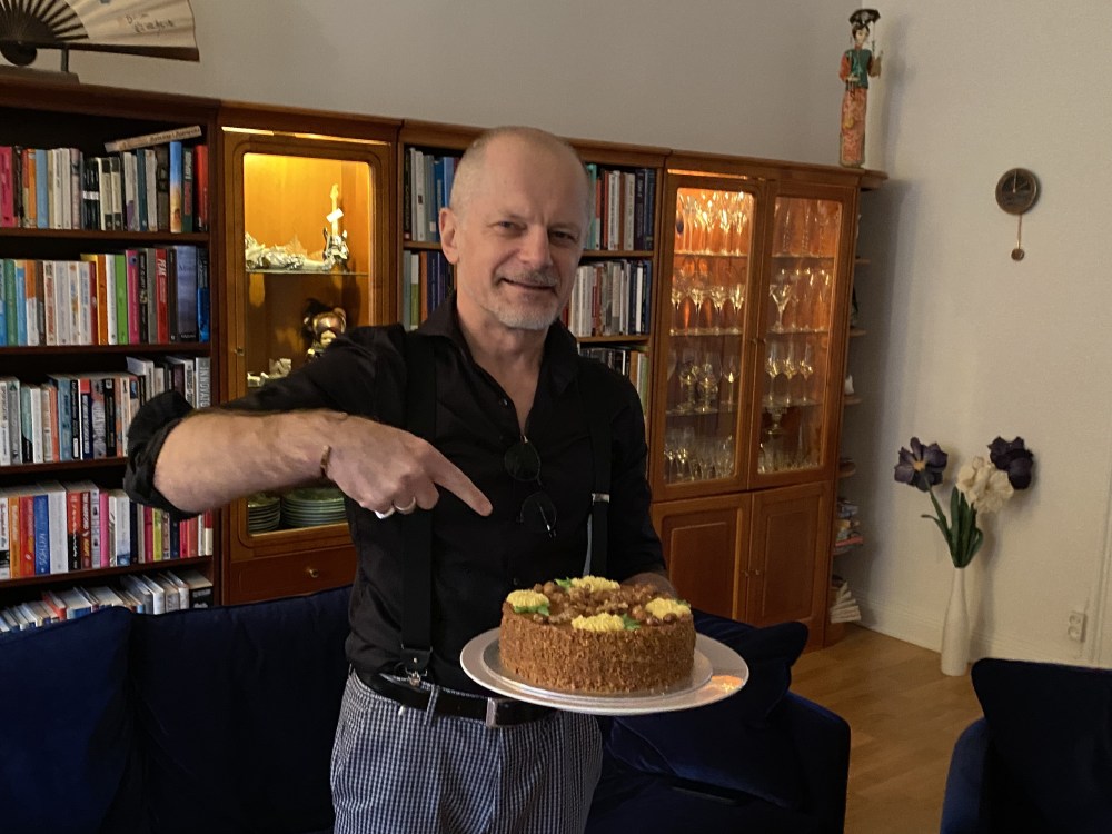 Hemma igen och det var dags för traditionsenligt födelsedagsfika men i år var något annorlunda för tårtan var en Kievskitårta så gissa om Anatoli blev glad. Många barndomsminnen så klart. Nu var det tyvärr ingen i familjen som bakat utan Masha fick rekrytera en äkta bakkunnig mamma som kom hit som flykting.